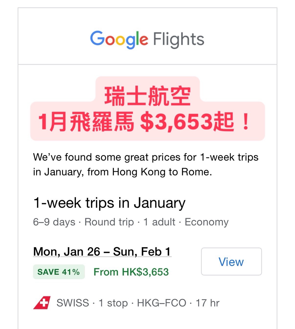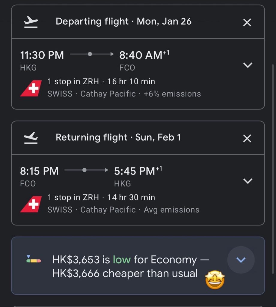 1月飛羅馬 $3,653起!瑞士航空,一次轉機,來回包稅。比平時平咗$3,600幾,適合想冬天遊歐洲的朋友。
