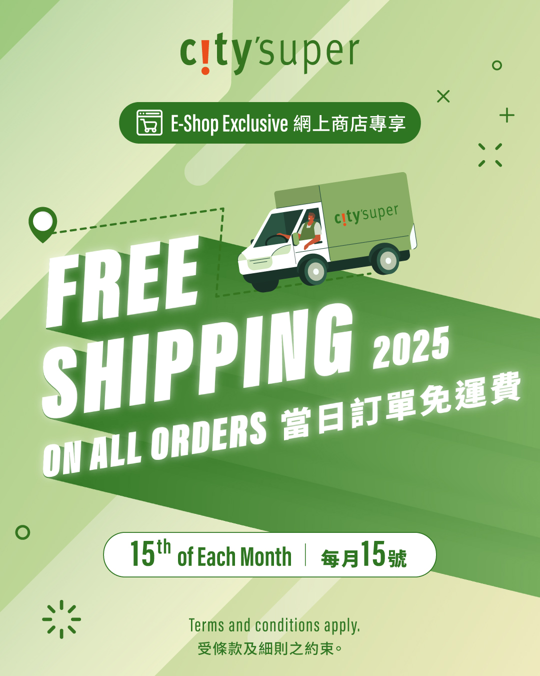 每月15日凡於city’super網上商店購物,即享免運費*優惠!只限一天,立即將心儀商品帶回家!