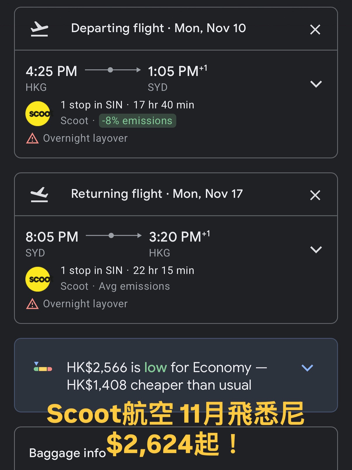 11月飛悉尼 $2,566起!Scoot航空,一次轉機,來回包稅。比平時平咗$1,400幾,適合想平遊澳洲的朋友。