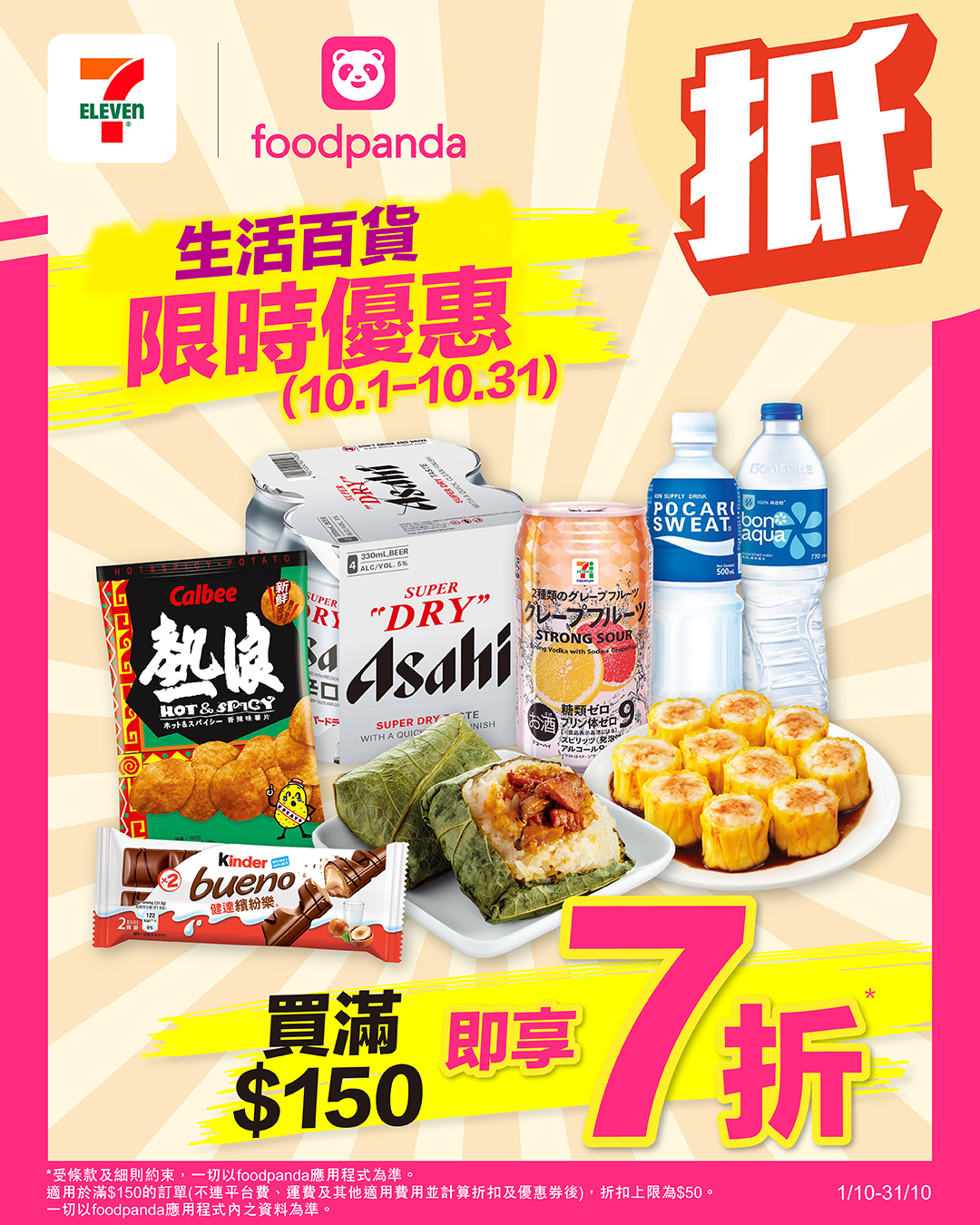7-Eleven 同 foodpanda 嘅生活百貨又有限時優惠啦!由而家開始到10月31號,只要喺 foodpanda 嘅生活百貨入面,揀 7-Eleven 嘅貨品,買滿 $150(未計運費同其他收費),就可以即刻享有七折優惠。快啲打開個 app 落單入貨啦!