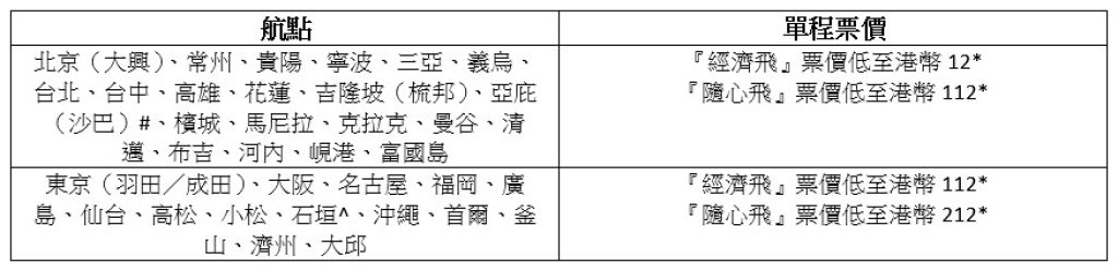 只要預訂來回機票,日本或者韓國航點,單程票價最低只係港幣$112;其他航點仲抵,低至港幣$12!出發日期由2026年4月一直到2027年3月。