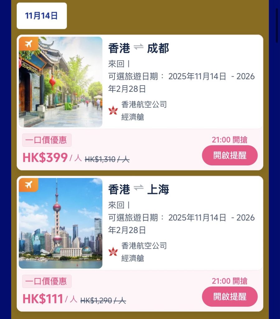 💰 成都 HK$399 / 人 | 上海 HK$111 / 人