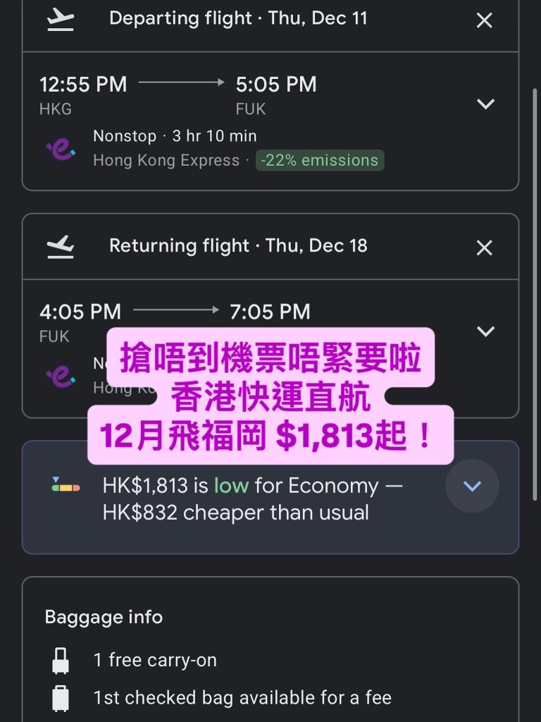 頭先搶唔到機票 唔緊要啦,12月飛福岡 $1,813都唔算太貴!香港快運直航,來回包稅,比平時平咗$800幾,適合聖誕節快閃日本九州。