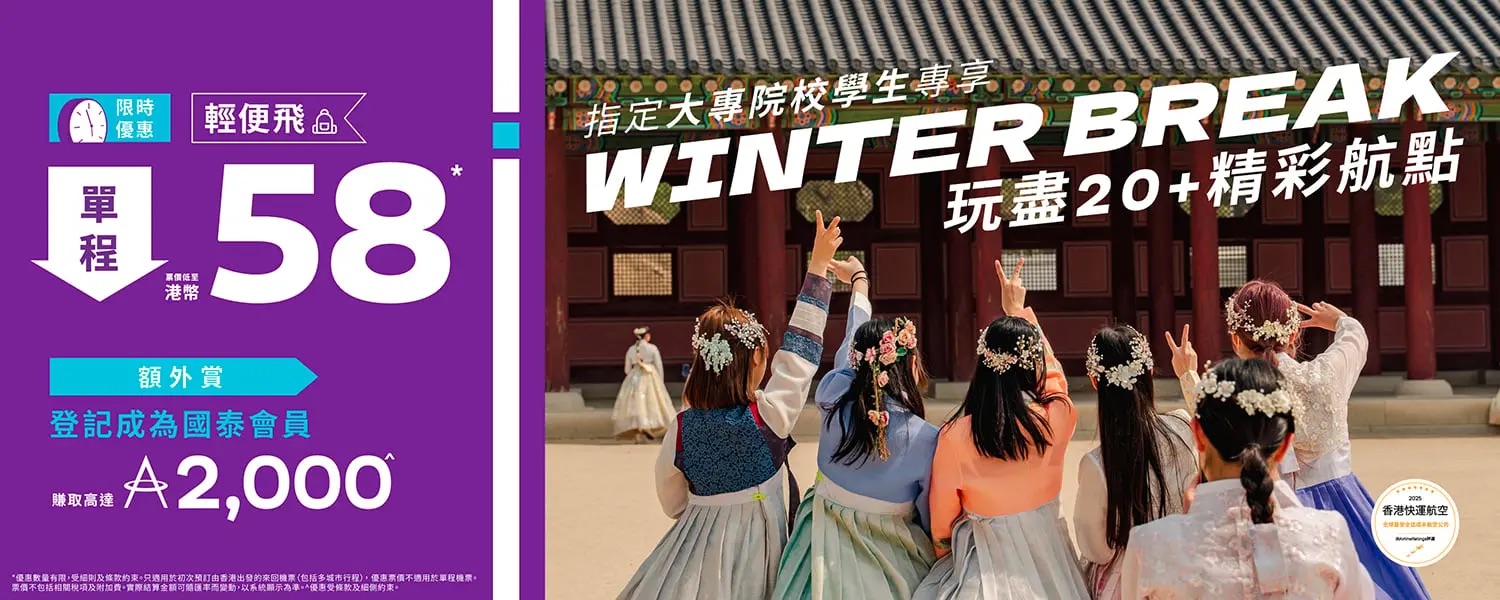 香港快運推出限時大專學生優惠,合資格學生可以特惠價購買機票 (同行旅客係大專學生都得)