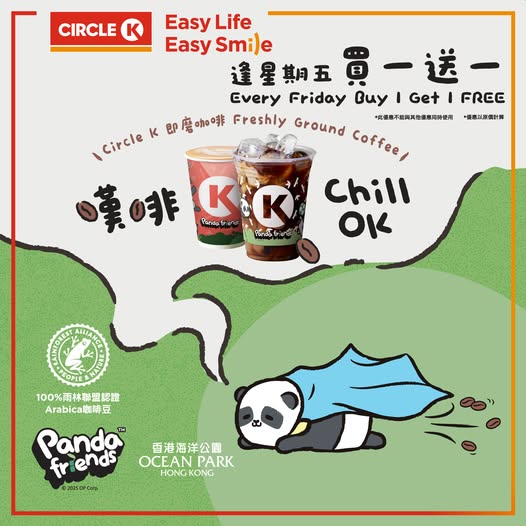 OK便利店而家同香港海洋公園Panda Friends合作,將熊貓得意樣印喺咖啡專區同咖啡杯上面。推廣期間,大家可以嚟Circle K飲杯即磨咖啡,同熊貓一齊提提神。
