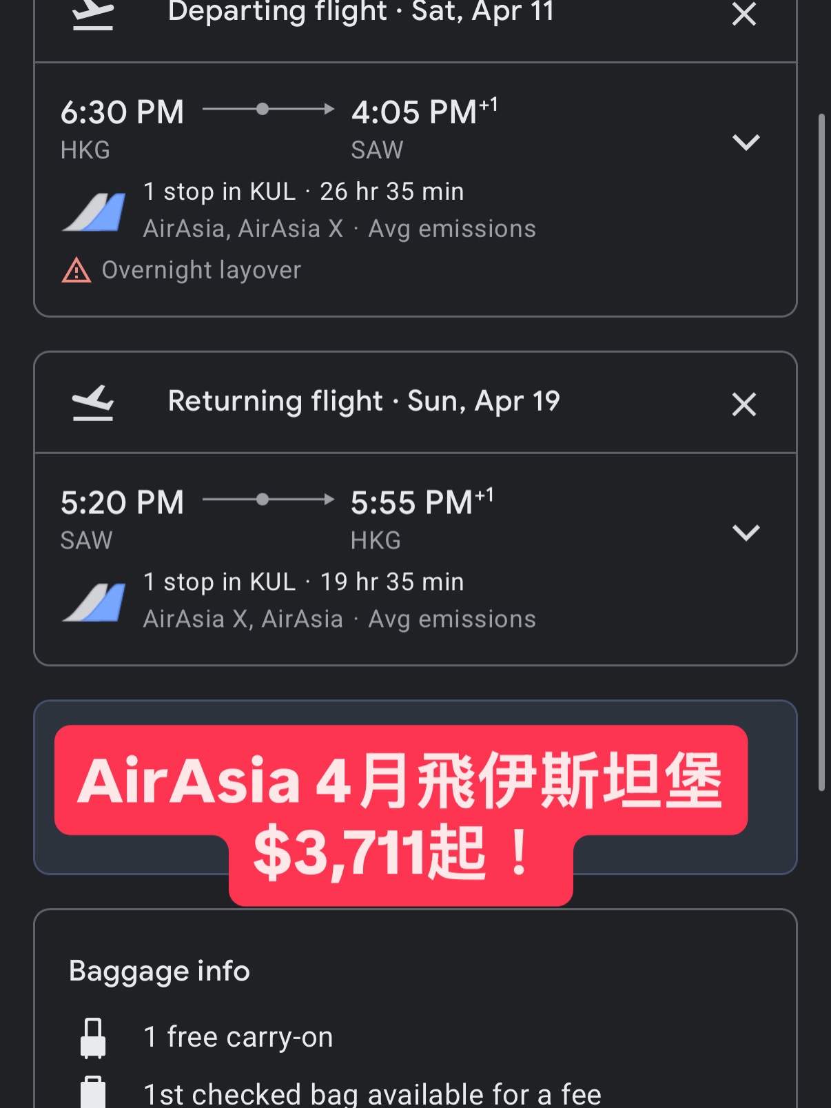 4月飛伊斯坦堡 $3,711起!AirAsia,一次轉機,來回包稅。比平時平咗$7,700幾,真係好抵。適合春天遊土耳其。