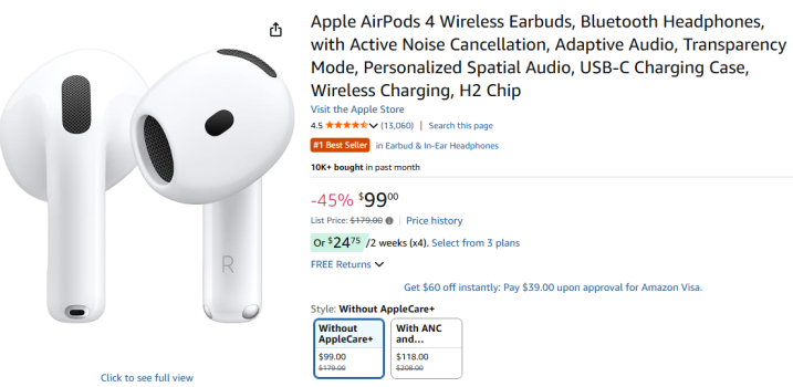 呢個熱門優惠仲有貨!Amazon現正特價發售Apple AirPods 4 (型號:MXP93LL/A)。