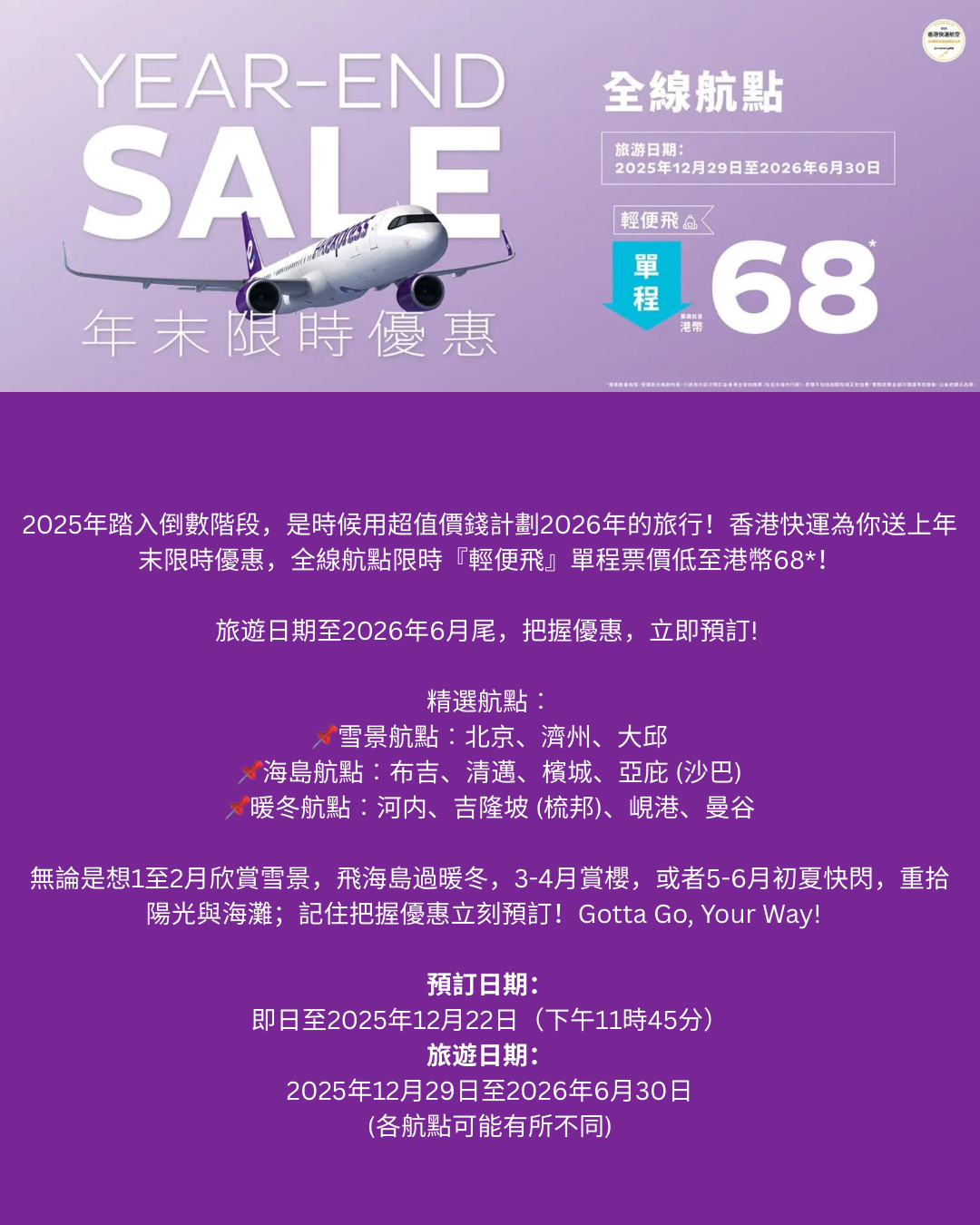 年尾係時候計劃下年旅行!香港快運推出年末優惠,全線航點 「輕便飛」單程票價低至$68,旅遊日期去到2026年6月尾。