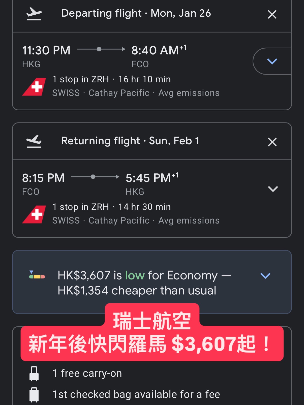 新年後快閃羅馬 $3,607起!瑞士航空,一次轉機,來回包稅。比平時平咗$1,300幾。2月出發,避開旺季,適合想遊歐洲的朋友。