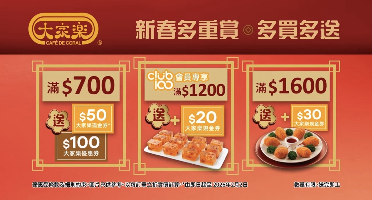 除咗快閃優惠,根據大家樂官方海報,仲有幾個恆常嘅「滿額送」Tier,去到 2 月 2 日都仲有: