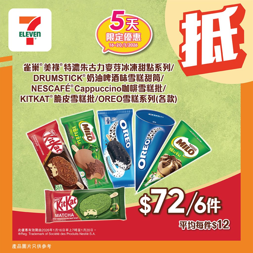 由 1 月 16 日(星期五) 開始,7-Eleven 推出一連 5 日快閃優惠,雀巢甜筒低至 $6.9 一支,而平時賣得幾貴嘅 Oreo 同美祿系列都只係 $12!