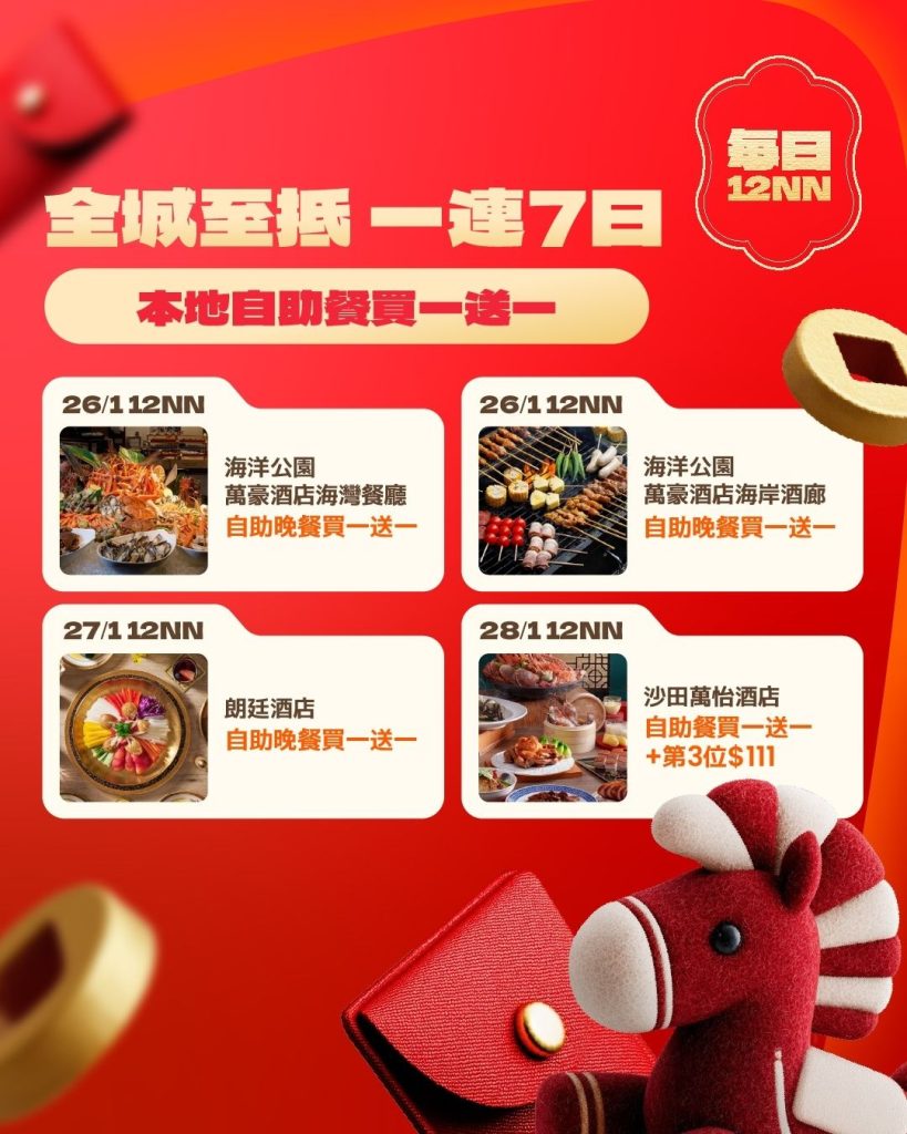 由 1 月 27 日 起,每日中午 12:00 準時開搶,多間五星級酒店 Buffet 做緊 買一送一,最平百幾蚊就食到!