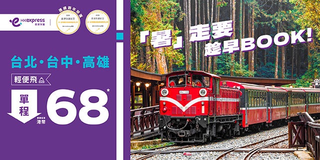 - 優惠價: 台北/台中/高雄「輕便飛」單程低至 HK$68;包 20KG 寄艙行李「隨心飛」單程都只係 HK$148!(未連稅及附加費)