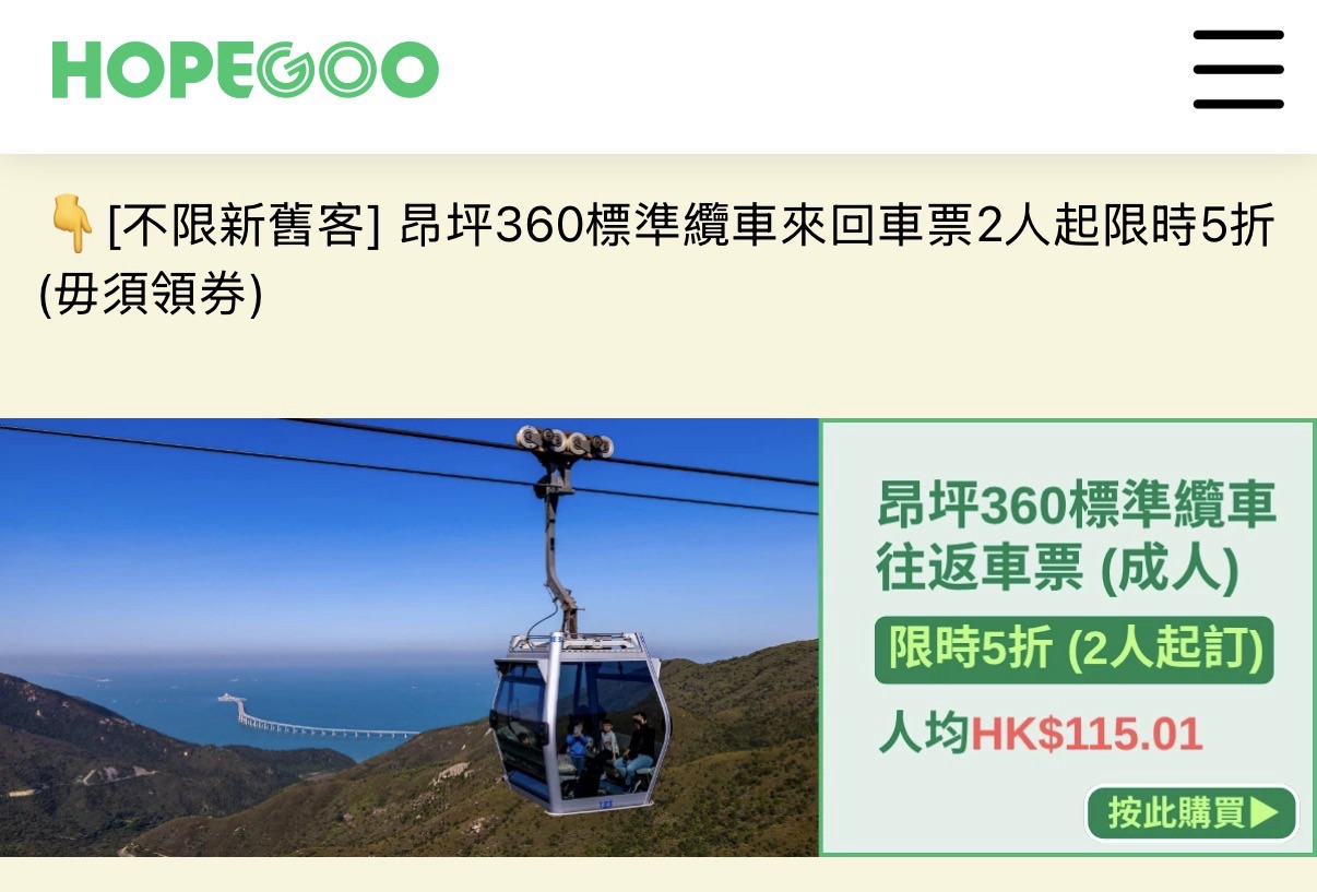 平時買昂坪 360 來回車飛閒閒地都二百幾蚊張,小編啱啱見到 HopeGoo 突發推出極震撼嘅「限時 5 折」神 Deal!
